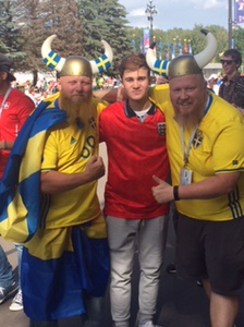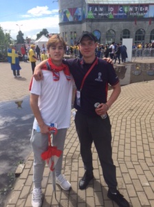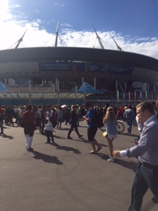 Big Day! We got up and ventured to the Fifa ticket site on way to stadium. Scored tickets for 5pm game!! $150 each. Sweden v Switzerland Only a smattering of each set of fans. Very boring game. Great stadium. Built at excessive cost with backhanders etc…aren’t they all?Beautiful walk and surroundings. Oliver got a haircut.Made it back to the city for pizza and then the splendid tight fitting St Petersburg-slap-bang-in-the-middle-of-the-city fan park. Great setting with backdrop of beautiful buildings. Talked to lots of people and great crowd. 50-50 England/colombia fans.Penalties, then mayhem! Oliver danced with his top off with strangers. Read that again. So much fun. There was even random German guy co-opted by the England fans. Some good songs. I love the Vardy’s having a party one, and the “Drinking all your vodka” one has a good tune. “Who are you?” And “you couldn’t score in a brothel” raised Russian eyebrows! We then hit bars and I found my favourite beers! Brilliant. Then met a Sunderland fan. Click on the video link for that one!